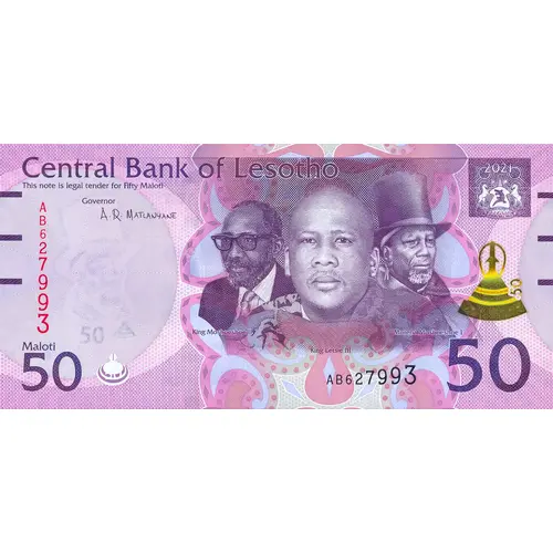 Central Bank of Lesotho This note is legal tender for Fifty Maloti Maloti 50 50 |