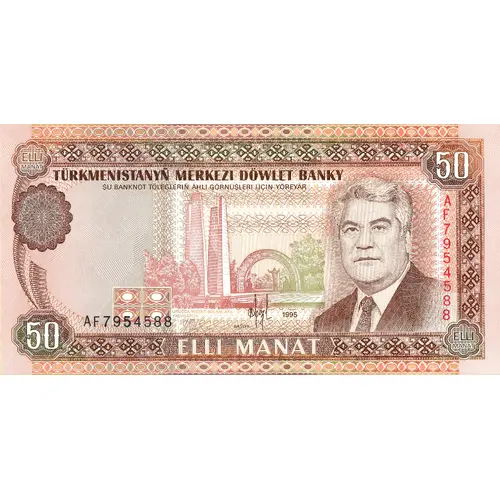 | Obverse lettering | TÜRKMENISTANYÑ MERKEZI DÖWLET BANKY $U BANKNOT TÖLEGLERIÑ ÄHLI GÖRNÜ$LERI ÜÇIN ҰÖREҰÄR ELLI MANAT (Translation: Central State Bank of Turkmenistan, This banknote is valid for all types of payments, Fifty Manat) |