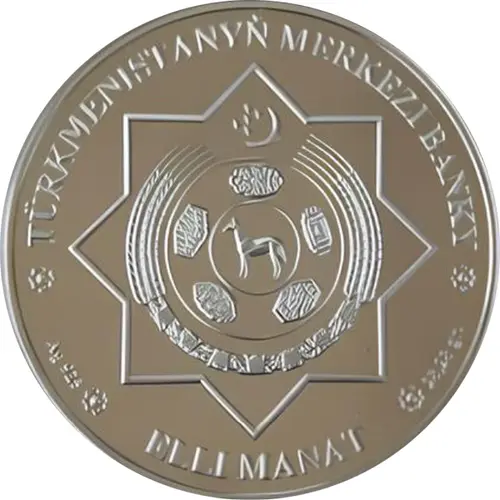 Opis líce * TÜRKMENISTANYÑ MERKEZI BANKY * Ag 925* ELLI MANAT * 28,28 gr.