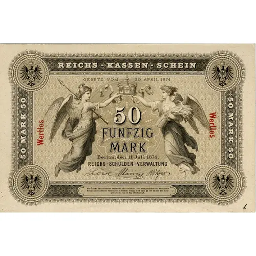 REICHS-KASSEN-SCHEIN GESETZ VOM 30 APRIL 1874 50 FUNFZIG MARK FUNFZIG MARK Berlin, den 11. Juli 1874. REICHS-SCHULDEN-VERWALTUNG Wer Reichs-Kassen-Scheine nachmacht oder verfälscht, oder nachgemachte, oder verfälschte Reichs-Kassen-Scheine wissentlich in Verkehr bringt, wird nach §§. 146 bis 149 des Straf- gesetzbuchs vom 15. Mai 1871 bestraft. 50 MARK 50 Wertlos (Translation: Imperial Treasury Note. Law of 30 April 1874. Fifty Mark. Imperial Debt Administration. Whoever counterfeits or falsifies Imperial Treasury Notes, or knowingly puts counterfeit or falsified Imperial Treasury Notes into circulation, shall be punished according to §§. 146 to 149 of the Criminal Code of May 15, 1871. Penal Code of 15 May 1871. Worthless.) |