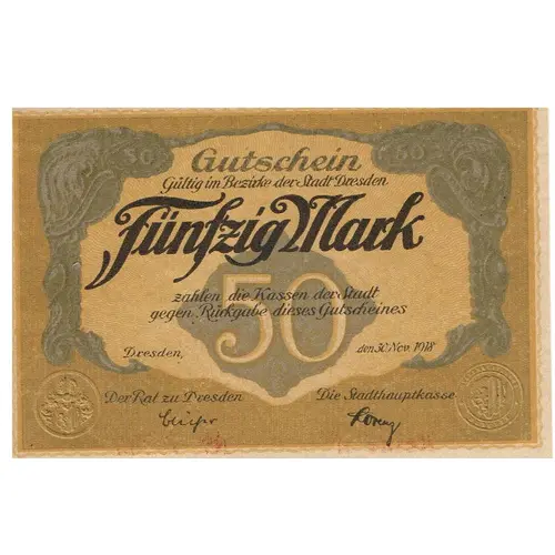 | Obverse lettering | Gutschein Gültig im Bezirke der Stadt Dresden Fünfzig Mark zahlen die Kassen der Stadt Dresden gegen Rückgabe dieses Gutscheins Dresden, den 30. Nov. 1918 |
