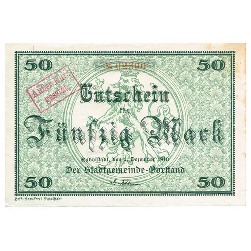 | Obverse lettering | Gutschein für Fünfzig Mark Rudolstadt, den 1. Dezember 1918 Der Stadtgemeinde-Vorstand |