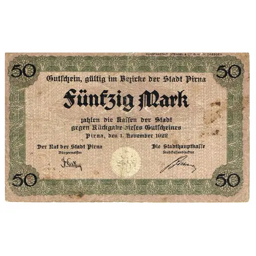 | Надписи лицевой стороны | Gutschein, gültig im Bezirke der Stadt Pirna Fünfzig Mark zahlen die Kassen der Stadt gegen Rückgabe dieses Gutscheines Pirna, den 1. November 1922 |