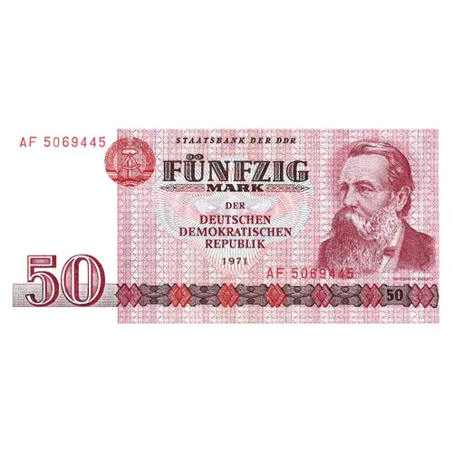 STAATSBANK DER DDR FÜNFZIG MARK DER DEUTSCHEN DEMOKRATISCHEN REPUBLIK (Translation: State Bank of the GDR Fifty Marks of the German Democratic Republic) |
