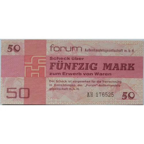 | Obverse lettering | 50 forum Außenhandelsgesellschaft m. b. H. Scheck über FÜNFZIG MARK zum Erwerb von Waren Der Scheck ist vorgesehen für die Verrechnung in Einrichtungen der `Forum`-Außenhandels- gesellschaft m. b. H. 50 AH 176525 50 (Translation: forum Foreign trade company Ltd. Cheque for fifty marks for the purchase of goods This cheque is intended for payment in facilities of `forum`-Foreign trade company Ltd.) |