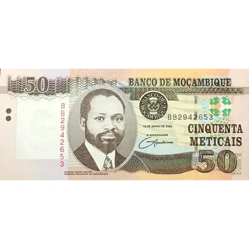 | Obverse lettering | 50 BANCO DE MOÇAMBIQUE BANCO • DE • MOÇAMBIQUE • 16 DE JUNHO DE 2006 O GOVERNADOR CINQUENTA METICAIS SAMORA MOISÉS MACHEL, PRIMEIRO PRESIDENTE DE MOÇAMBIQUE (Translation: 50 Bank of Mozambique Bank • of • Mozambique • 16 of June of 2006 The Governor Fifty Meticais Samora Moises Machel, first president of Mozambique) |