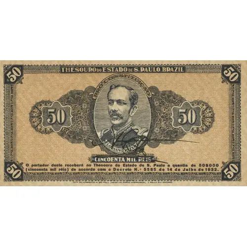 | Obverse lettering | 50 50 THESOURO DO ESTADO DE S. PAULO BRAZIL PRÓ CONSTITUIÇÃO 50 50 FLORIANO PEIXOTO CINCOENTA MIL REIS O portador deste receberá no Thesouro do Estado de S. Paulo a quantia de 50$000 (cinquenta mil réis) de accordo com o Decreto N.º 5585 de 14 de Julho de 1932. 50 50 COMP. MELHORAMENTOS DE SÃO PAULO (WEISZFLOG IRMÃOS INCORPORADA) S. PAULO - RIO - CAYEIRAS. (Translation: Treasury of the State of São Paulo. Brazil Pró Constitution Floriano Peixoto Five Thousand Réis The bearer of this will receive at the Treasury of the State of São Paulo the amount of 50$000 (fifty thousand réis) in accordance with Decree No. 5585 of 14 July 1932. Companhia Melhoramentos de São Paulo (Weiszflog Brothers Incorporated) São Paulo - Rio - Cayeiras.) |