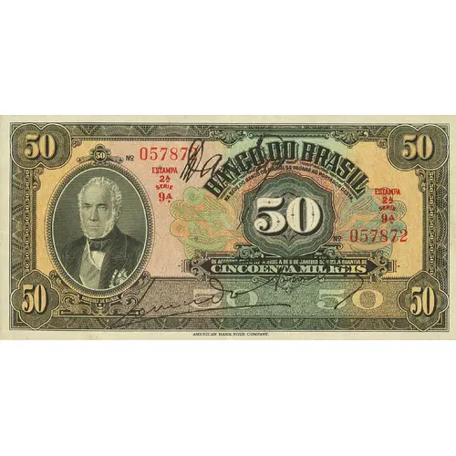| Obverse lettering | 50 50 BANCO DO BRASIL NA SEDE DO BANCO DO BRASIL, SE PAGARÁ AO PORTADOR DESTA 50 DE ACCORDO COM A LEI N.4635A DE 8 DE JANEIRO DE 1923. A QUANTIA DE CINCOENTA MIL REIS 50 50 50 50 AMERICAN BANK NOTE COMPANY (Translation: Bank of Brazil at the headquarters of Banco do Brasil, the holder of this according to law no. 4635A of January 8, 1923. the amount of Fifty Thousand Réis American Bank Note Company) |