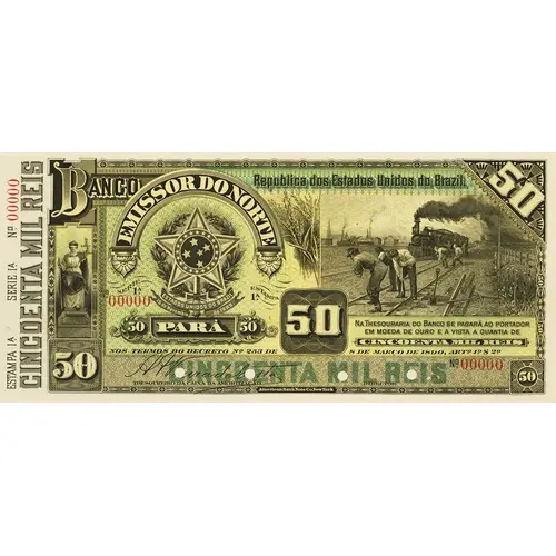 | Obverse lettering | República Dos Estados Unidos do Brazil BANCO EMISSOR DO NORTE PARÁ NA THESOURARIA DO BANCO SE PAGARÁ AO PORTADOR EM MOEDA DE OURO E À VISTA A QUANTIA DE CINCOENTA MIL RÉIS 50 NOS TERMOS DO DECRETO NÚMERO 253 DE 8 DE MARÇO DE 1890, ART 1º & 2º CINCOENTA MIL RÉIS American Bank Note Co., New York (Translation: Republic of United States of Brazil Northern Issuing Bank In the bank`s treasury the amount will be paid in gold and in sight Fifty Thousand Reis In accordance with the Decree number 253 of March 8, 1890, Art 1 and 2 Fifty Thousand Reis American Bank Note Co., New York) |