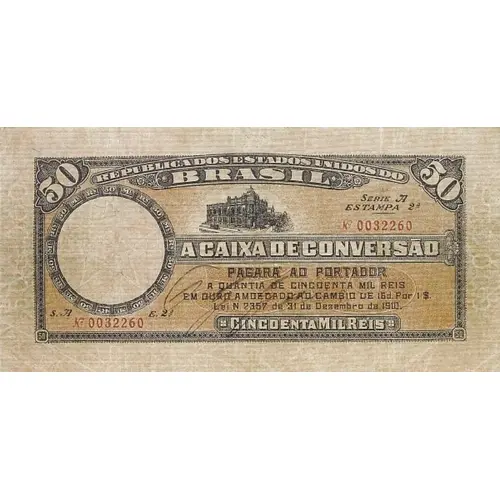 | Obverse lettering | 50 50 REPUBLICA DOS ESTADOS UNIDOS DO BRASIL A CAIXA DE CONVERSÃO PAGARÁ AO PORTADOR A QUANTIA DE CINCOENTA MIL REIS EM OURO AMOEDADO AO CAMBIO DE 16d. Por 1 $. Lei N. 2357 de 31 de Dezembro de 1910. CINCOENTA MIL RÉIS 50 50 (Translation: The Conversion Fund will pay the holder the amount of fifty Thousand Réis in gold plated at a 16d exchange rate. for $ 1. Law No 2357 of December 31, 1910. Fifty Thousand Réis) |