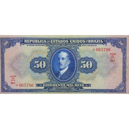 | Obverse lettering | CINCOENTA CINCOENTA 50 50 REPUBLICA DOS ESTADOS UNIDOS DO BRAZIL NO THESOURO NACIONAL SE PAGARÁ AO PORTADOR DESTA A QUANTIA DE L CINCOENTA 50 CINCOENTA L 50 50 CINCOENTA MIL REIS VALOR RECEBIDO 50 50 CINCOENTA CINCOENTA American Bank Note Company (Translation: Republic of the United States of Brazil In the National Treasury will be paid to the carrier of this amount of Fifty Thousand Réis Amount Received American Bank Note Company) |