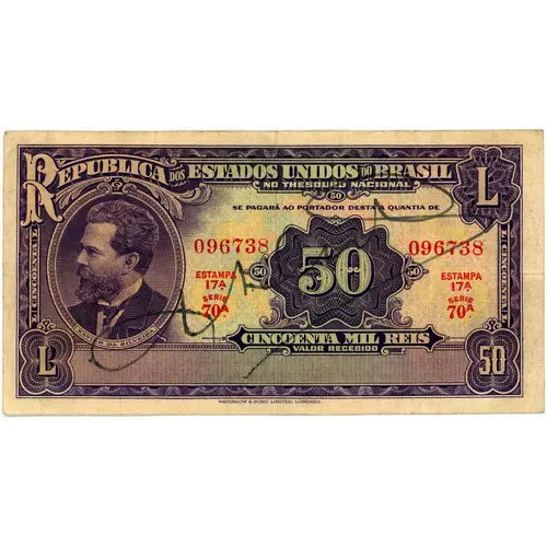| Reverse lettering | REPUBLICA DOS ESTADOS UNIDOS DO BRASIL 50 L CINCOENTA MIL REIS L 50 WATERLOW & SONS LIMITED, LONDRES. (Translation: Republic of the United States of Brazil Fifty Thousand Réis Waterlow & Sons Limited, Londres.) |
