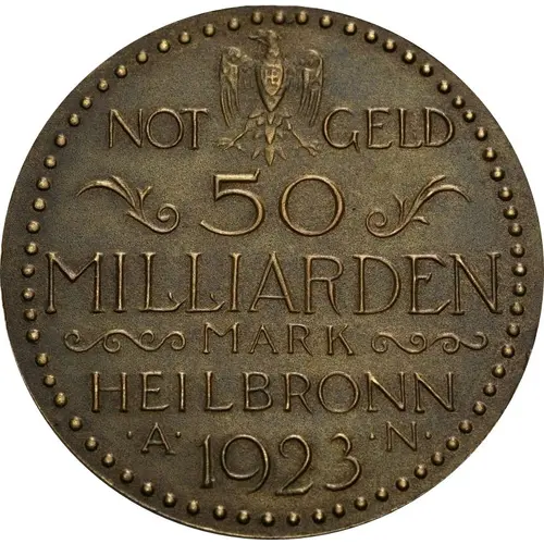 | Ön yüz lejandı | NOT GELD 50 MILLIARDEN MARK HEILBRONN • A • 1923 • N • |