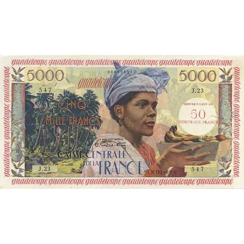 guadeloupe 5000 CINQ MILLE FRANCS CONTRE-VALEUR DE 50 NOUVEAUX FRANCS CAISSE CENTRALE DE LA FRANCE D`OUTRE-MER (Translation: Guadeloupe Five Thousand Francs Counter-value of Fifty New Francs Central Fund of Overseas France) |