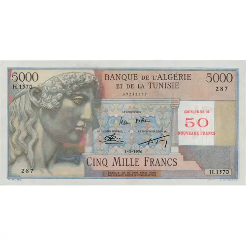 | Obverse lettering | BANQUE DE L`ALGÉRIE ET DE LA TUNISIE LE GOUVERNEUR LE CAISSIERE GÉNÉRAL LE SECRÉTAIRE GÉNÉRAL CONTRE-VALEUR DE 50 NOUVEAUX FRANCS CINQ MILLE FRANCS L`ARTICLE 139 DU CODE PÉNAL PUNIT DES TRAVAUX FORCÉS LE CONTREFACTEUR W. FEL FEC. A. MARLIAT SC. |