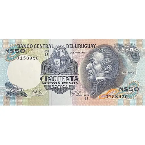| Opis líce | BANCO CENTRAL DEL URUGUAY LEY Nº 14.316 CINCUENTA NUEVOS PESOS MONEDA NACIONAL ARTIGAS (Translation: Central Bank of Uruguay Law# 14,316 Fifty Nuevos Pesos National Currency Artigas) |
