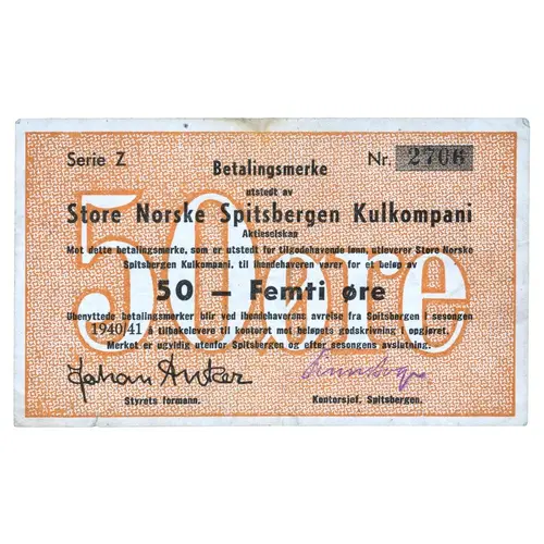 Betalingsmerke utstedt av Store Norske Spitsbergen Kulkompani Aktieselskap Mot dette betalingsmerke, som er utstedt for tilgodehavende lønn, utleverer Store Norske Spitsbergen Kulkompani, til ihendehaveren varer for et beløp av 50 - Femti øre Ubenyttede betalingsmerker blir ved ihendehaverens avreise fra Spitsbergen i sesongen 1941/42 å tilbakelevere til kontoret mot beløpets godskrivning i opgjøret. Merket er ugyldig utenfor Spitsbergen og efter sesongens avslutning. Styrets formann. Kontorsjef, Spitsbergen. (Translation: Payment note issued by The Great Norwegian Spitsbergen Coal Company Against this payment note, which is issued for outstanding wages, The Great Norwegian Spitsbergen Coal Company delivers to the bearer goods for an amount of 50 øre Unused notes when the beares departs from Spitsbergen during the season 1941/42 is returned to the office against credit of the amount in the settlement. The note is invalid outside Spitsbergen and after the end of the season. Chairman of the board. Office manager, Spitsbergen.) |