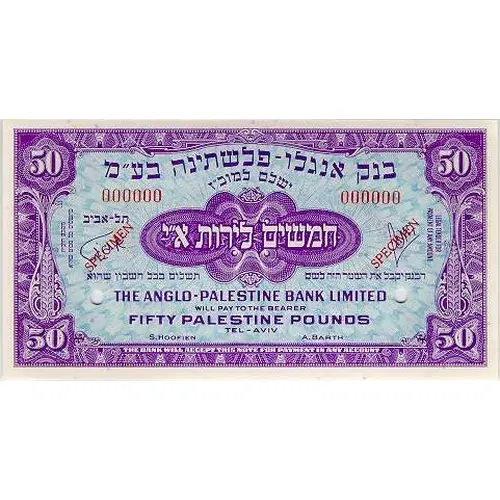 50 בנק אנגלו-פלשתינה בע`מ תל-אביב ישלם למוכ`ז חמשים לירות א`י הבנק יקבל השטר הזה לשלם תשלום בכל חשבון שהוא THE ANGLO-PALESTINE BANK LIMITED WILL PAY TO THE BEARER FIFTY PALESTINE POUNDS TEL-AVIV LEGAL TENDER FOR PAYMENT OF ANY AMOUNT מטבע חוקית לתשלום כל סכום שהוא THE BANK WILL ACCEPT THIS NOTE FOR PAYMENT IN ANY ACCOUNT |