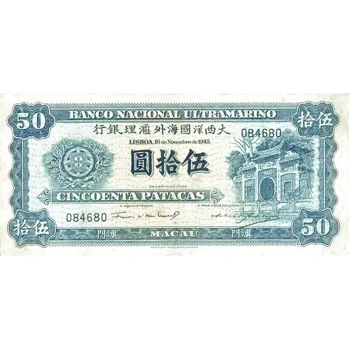 | Obverse lettering | BANCO NACIONAL ULTRAMARINO 行銀理滙外海國洋西大 LISBOA, 16 de Novembro de 1945. 圓拾伍 DECRETO № 17154 CINCOENTA PATACAS O ADMINISTRADOR | O PRESIDENTE DE CONSELHO ADMINISTRATIVO 門澳 MACAU 門澳 |