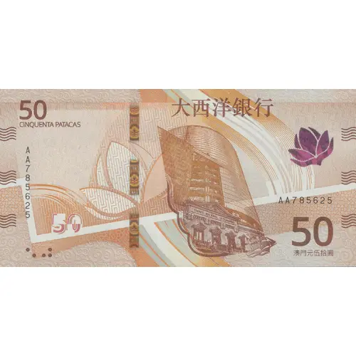 | Obverse lettering | 50 大西洋銀行 CINQUENTA PATACAS 50 澳門元伍拾圓 (Translation: Great Atlantic Bank Fifty Patacas Fifty Macanese Patacas) |