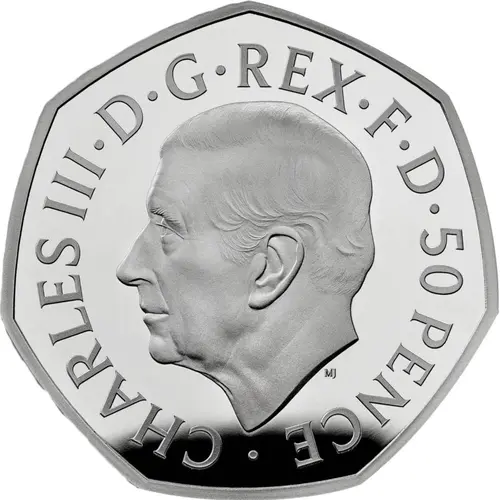 CHARLES III·D·G·REX·F·D·50 PENCE · MJ (Translation: Charles the Third by the Grace of God King Defender of the Faith) |