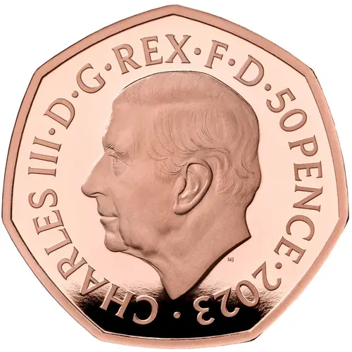 CHARLES III·D·G·REX·F·D·50 PENCE·2023 · MJ (Translation: Charles the Third by the Grace of God King Defender of the Faith) |