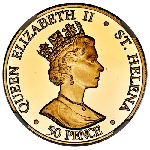 | Надписи аверса | QUEEN ELIZABETH II · ST. HELENA RDM · 50 PENCE · |
