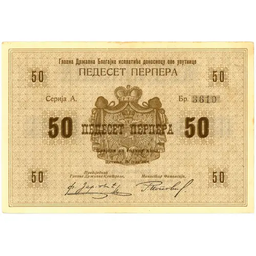 Главна Државна Благајна исплатиће доносиоцу упутнице 50 ПЕДЕСЕТ ПЕРПЕРА 50 Серија А. Бр. 3610 50 ПЕДЕСЕТ ПЕРПЕРА 50 Вриједи за годинy дана. Цетиње, 25. јула 1914. Предсједник Главне Државне Контроле, Министар Финансија, 50 50 |