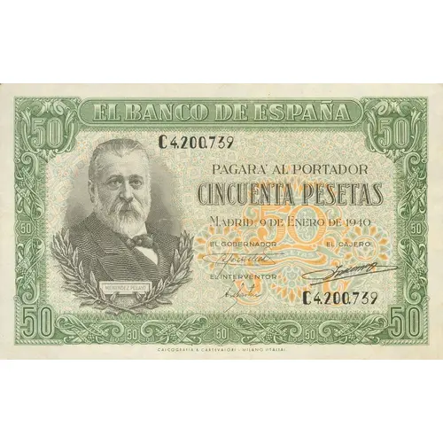 50 EL BANCO DE ESPAÑA PAGARÁ AL PORTADOR CINCUENTA PESETAS MADRID, 9 DE ENERO DE 1940 EL GOBERNADOR. EL INTERVENTOR. EL CAJERO MENENDEZ PELAYO CALCOGRAFIA & CARTEVALORI - MILANO (ITALIA) (Translation: The Bank of Spain will pay the carrier Fifty Pesetas Madrid, January 9, 1940 The Governor. The Comptroller. The Cashier) |