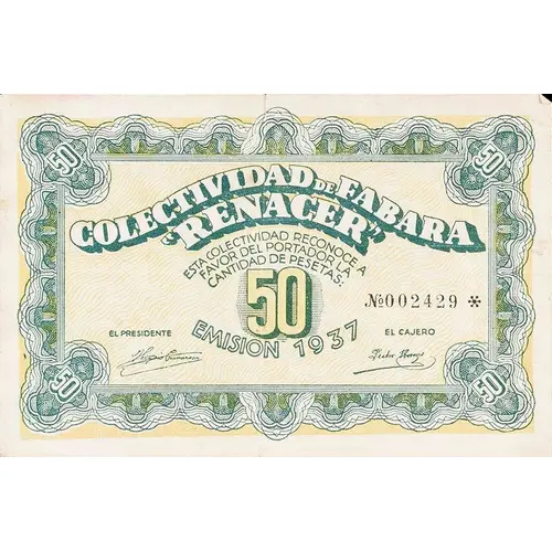 COLECTIVIDAD DE FABARA `RENACER` ESTA COLECTIVIDAD RECONOCE A FAVOR DEL PORTADOR LA CANTIDAD DE PESETAS: 50 EMISION 1937 (Translation: Collectivity of Fabara `Renacer` This Collectivity recognizes in favor of the bearer the amount of pesetas: 50 Issue 1937) |