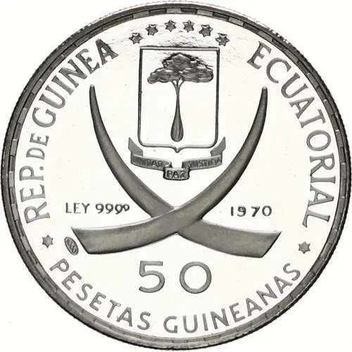 | Obverse lettering | REP.DE GUINEA ECUATORIAL LEY 9999 1970 50 PESETAS GUINEANAS (Translation: Republic of Equatorial Guinea .9999 Purity 50 Guinean Pesetas) |