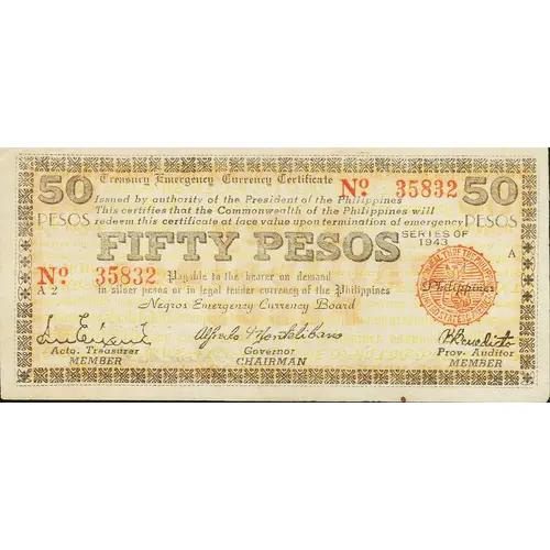 | Obverse lettering | TREASURY EMERGENCY CURRENCY CERTIFICATE ISSUED BY AUTHORITY OF THE PRESIDENT OF THE PHILIPPINES THIS CERTIFIES THAT THE COMMONWEALTH OF THE PHILIPPINES WILL REDEEM THIS CERTIFICATE AT FACE VALUE UPON TERMINATION OF EMERGENCY FIFTY PESOS PAYABLE TO THE BEARER ON DEMAND IN SILVER PESOS OT IN LEGAL TENDER CURRENCY OF THE PHILIPPINES NEGROS EMERGENCY CURRENCY BOARD |
