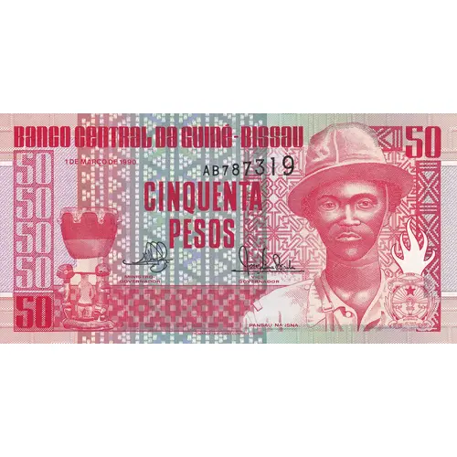 BANCO CENTRAL DA GUINÉ-BISSAU 1 DE MARÇO DE 1990 CINQUENTA PESOS PANSAU NA ISNA (Translation: Central Bank of Guinea-Bissau March 1st., 1990 Fifty Pesos) |