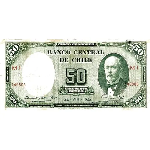 | Obverse lettering | CINCO CONDORES BANCO CENTRAL DE CHILE 50 CINCUENTA PESOS CONVERTIBLES EN ORO CONFORME A LA LEY TALLERES DE ESPECIES VALORADAS - SANTIAGO - CHILE (Translation: Five Condores Central Bank of Chile Fifty Pesos Convertible into Gold in Conformity with the Law) |