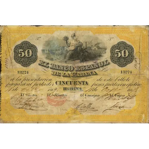Obverse lettering 50 EL BANCO ESPAÑOL DE LA HABANA á la presentación de este billete pagará al portador CINCUENTA pesos fuertes en efectivo. Habana, 11 de Octubre de 1869.