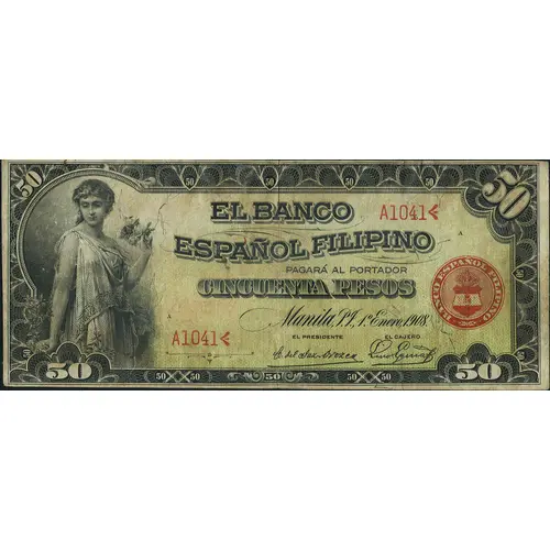 | Obverse lettering | EL BANCO ESPAÑOL FILIPINO PAGARÁ AL PORTADOR CINQUENTA PESOS MANILA (Translation: The Spanish-Filipino Bank will pay the bearer fifty pesos) |