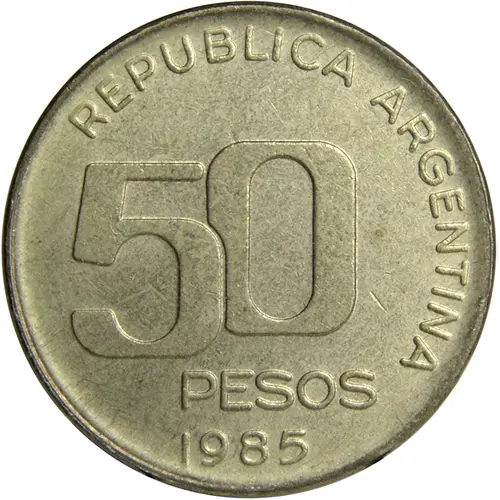 | Obverse lettering | REPUBLICA ARGENTINA 50 PESOS 1985 (Translation: Republic of Argentina 50 Pesos 1985) |