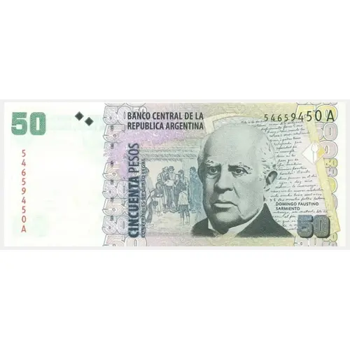 | Obverse lettering | BANCO CENTRAL DE LA REPUBLICA ARGENTINA CINCUENTA PESOS CONVERTIBLES DE CURSO LEGAL DOMINGO FAUSTINO SARMIENTO (Translation: Central Bank of the Argentine Republic Fifty Pesos Convertable of Legal Tender Domingo Faustino Sarmiento) |