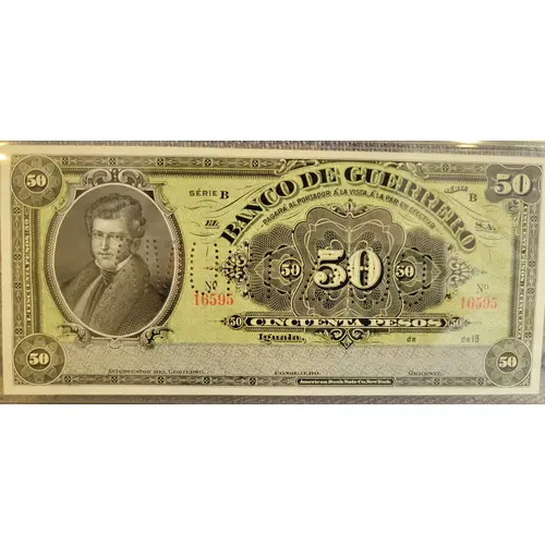 | Légende de l’avers | El Banco de Guerrero S.A. Pagará al portador á la vista, á la par, en effectivo Cincuenta Pesos Iguala, de de 19 (Translation: The Bank of Guerrero S.A. will pay the bearer on sight, at par, in cash Fifty Pesos) |