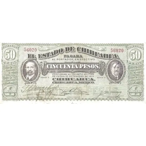 | Obverse lettering | EL ESTADO DE CHIHUAHUA PAGARA AL PORTADOR, EN EFECTIVO CINCUENTA PESOS, CONFORME AL DECRETO MILITAR DE FECHA 10 DE FEBRERO DE 1914 CHIHUAHUA, CHIHUAHUA, MEXICO. CINCUENTA PESOS (Translation: The State of Chihuahua will pay to the bearer in cash Fifty Pesos according to the military decree dated 10 February 1914) |