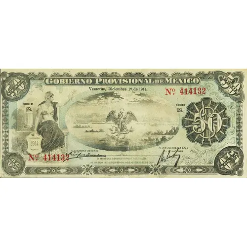 | Obverse lettering | VERACRUZ DECIEMBRE 1º DE 1914 LA TESORERIA RECIBIRA Y PAGARA ESTE BILLETE DE ACUERDO CON EL DECRETO 19 DE SEPTIEMBRE DE 1914. MEXICO OFICINA DEL GOBIERNO (Translation: Provisional Government of Mexico Veracruz December 1st, 1914 The treasury will recieve and pay this bill in accordance with the decree of 19 September 1914) |