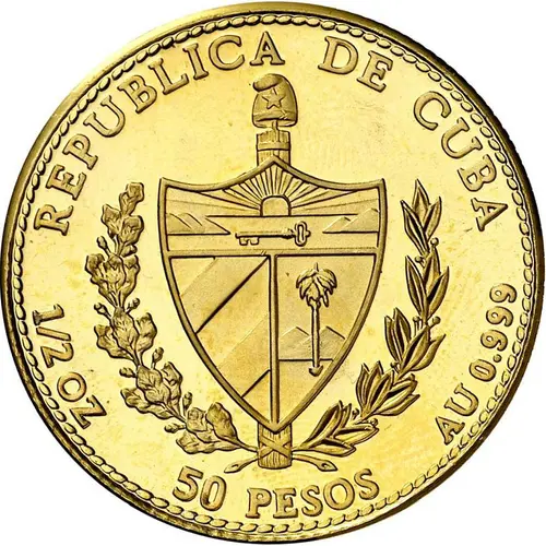 | Obverse lettering | REPUBLICA DE CUBA 1/2 OZ 50 PESOS AU 0.999 (Translation: Republic of Cuba 1/2 ounce 50 Pesos gold 0.999) |