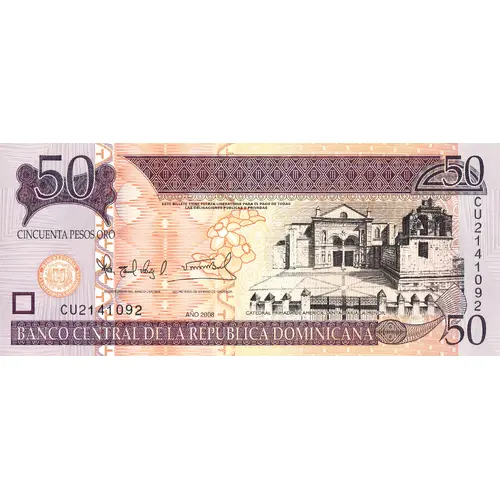 ESTE BILLETE TIENE FUERZA LIBERATORIA PARA EL PAGO DE TODAS LAS OBLIGACIONES PUBLICAS O PRIVADAS CINCUENTA PESOS ORO CATEDRAL PRIMADA DE AMERICA, SANTA MARIA LA MENOR BANCO CENTRAL DE LA REPUBLICA DOMINICANA (Translation: This banknote has liberatory force for the payment of all public or private obligations Fifty Pesos Gold First Cathedral of America, Santa María la Menor Central Bank of the Dominican Republic) |