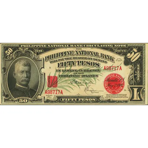PHILIPPINE NATIONAL BANK CIRCULATING NOTE THE PHILIPPINE NATIONAL BANK WILL PAY THE BEARER ON DEMAND FIFTY PESOS IN LAWFUL CURRENCY OF THE PHILIPPINE ISLANDS ISSUE UNDER THE PROVISIONS OF ACT NUMBER 2612 OF THE PHILIPPINE LEGISTATURE AS AMENDED BY ACT 2747 |