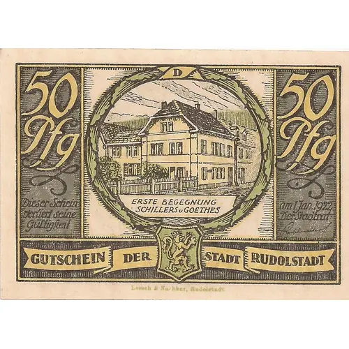 50Pfg 50Pfg ERSTE BEGEGNUNG SCHILLERS u GOETHES Dieser Schein verliert seine Gültigkeit am 1. Jan 1922 Der Stadtrat (signature) GUTSCHEIN DER STADT RUDOLSTADT Lorach & Nachbar, Rudolstadt (Translation: 50Pfg 50Pfg FIRST MEETING OF SCHILLER and GOETHE This certificate is no longer valid on Jan 1, 1922 The City Council (signature) VOUCHER OF THE CITY OF RUDOLSTADT Lorach & Nachbar, Rudolstadt) |