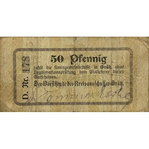 Lettering (regular font): 50 Pfennig zahlt die Kreisgemeindekasse in Grätz ohne Legitimationsprüfung dem Einlieferer dieses Gutscheines. Der Vorsikende des Kreisausschusses Grätz. |