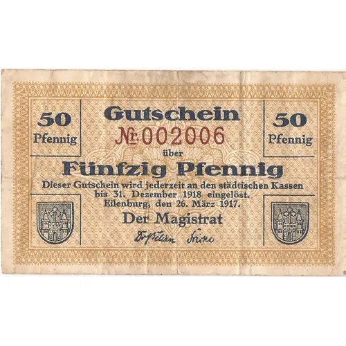 | Descrizione del dritto | 50 Gutschein 50 Pfennig Nr.002006 Pfennig über Fünfzig pfennig Dieser Gutschein wird jederzeit an den städtischen Kassen bis 31. Dezember 1918 eingelöst. Eilenburg, den 26. März 1917. Der Magistrat (Signature) |