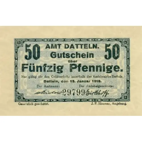 50 AMT DATTELN. 50 Gutschein über Fünzig Pfennige. Nur gültig für den Geldverkehr innerhalb des Amtsbezirks Datteln. Datteln, den 15. Januar 1918. Der Amtmann: Der Amtsbeigeordnete: (Signature) (Signature) Gesetzlich geschützt. J. P. Himmer, Augsburg. (Translation: 50 AMT DATTELN. 50 Coupon above Fifty pfennige. Only valid for money transactions within the Datteln district. Dates, January 15, 1918. The bailiff: The deputy: (Signature) (Signature) Protected by law. J.P. Himmer, Augsburg.) |