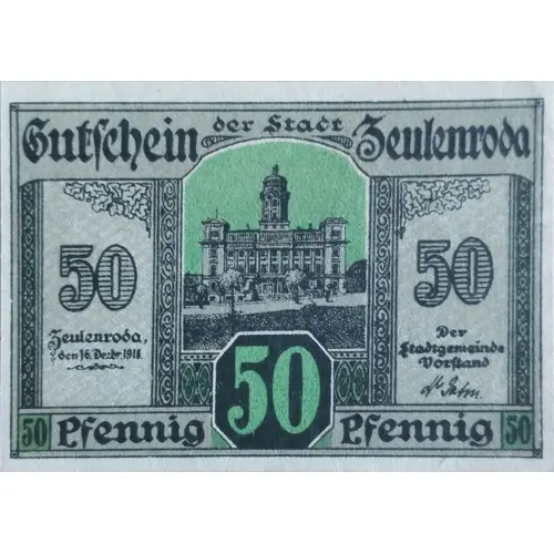 Opis líce Gutschein der Stadt Zeulenroda 50 Zeulenroda den 16 Dezbr. 1918 Der Stadtgemeinde Vorstand 50 Pfennig