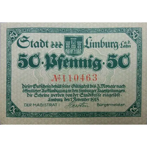 | Vorderseitenlegende | 50 50 50 50 Stadt Limburg a.d. Lahn 50 Pfennig 50 No.110463 Dieser Gutschein behält seine Gültikgeit bis 3 Monate nach öffentlicher Auskündigung in den Limburger Tageszeitungen. Die Scheine werden von der Stadtkasse eingelöst. Limburg den 1.November 1918 DER MAGISTRAT: Bürgermeister. |